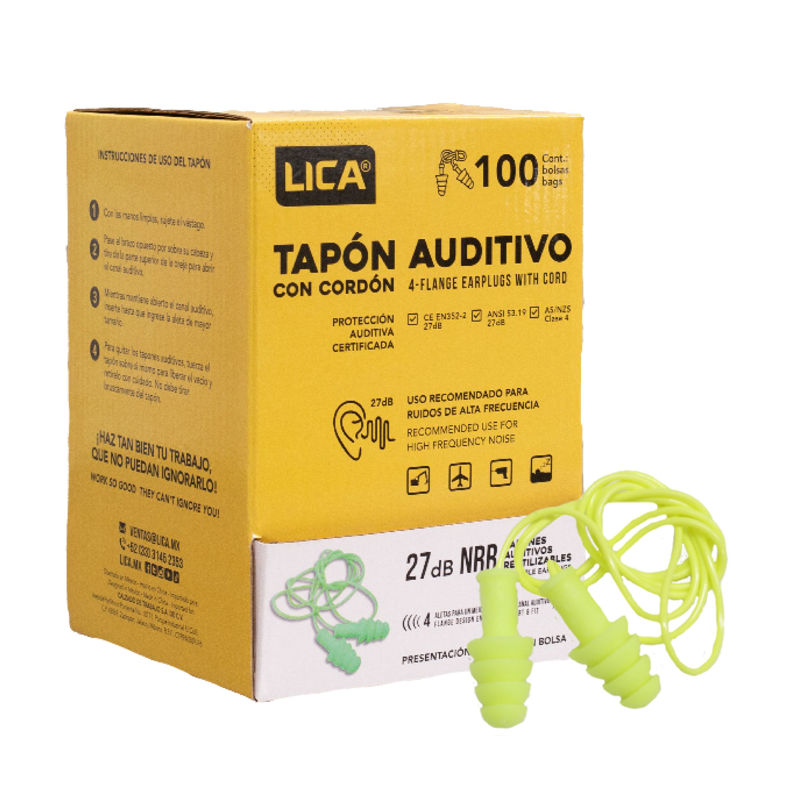 LICA reusable four-flange corded earplug TLRI27 with 27 dB noise reduction, 70 cm cord and retaining clip. Certifications: CE EN352-2 and ANSI S3.19.