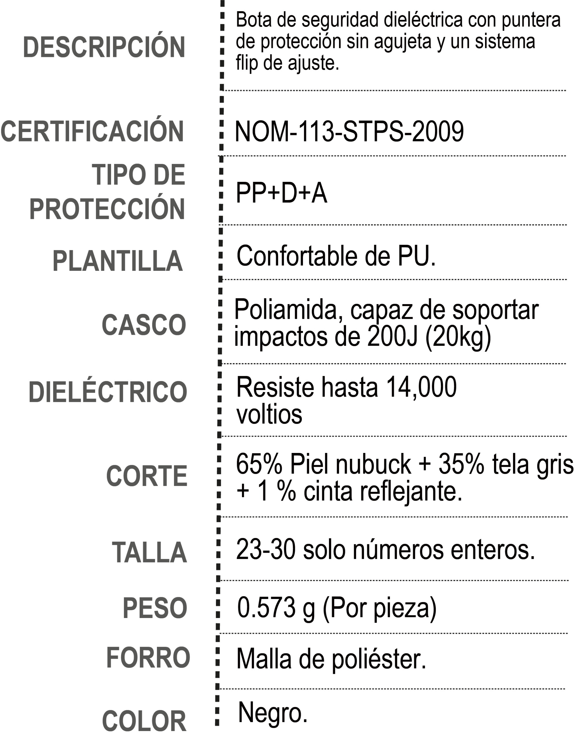 La bota de seguridad dieléctrica MOD. 125 está equipada con casquillo de poliamida dieléctrico que supera los estándares al soportar impactos de hasta 101.7 J y 14,000 voltios. Cuenta con plantilla anti-perforación para evitar cualquier accidente con objetos punzo cortantes, sistema de amarre tipo boa para un ajuste rápido y sencillo; Suela antiderrapante que brinda resistencia a la abrasión, al impacto y a la compresión, que garantiza una larga vida útil incluso en los entornos más desafiantes.
