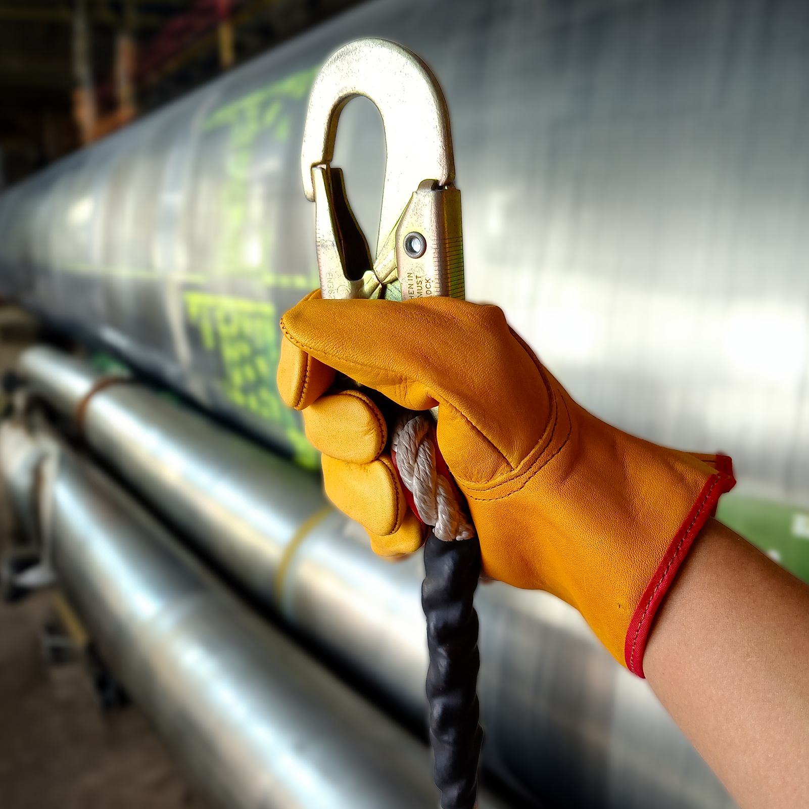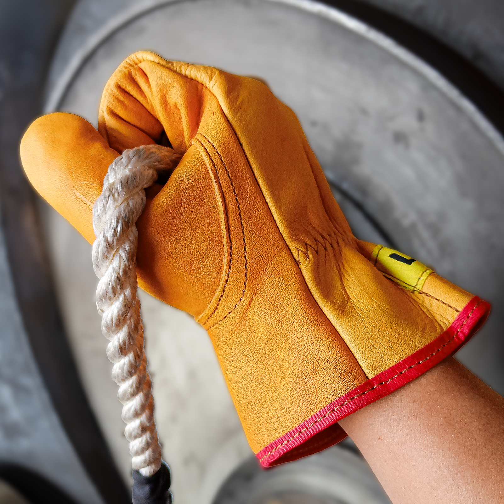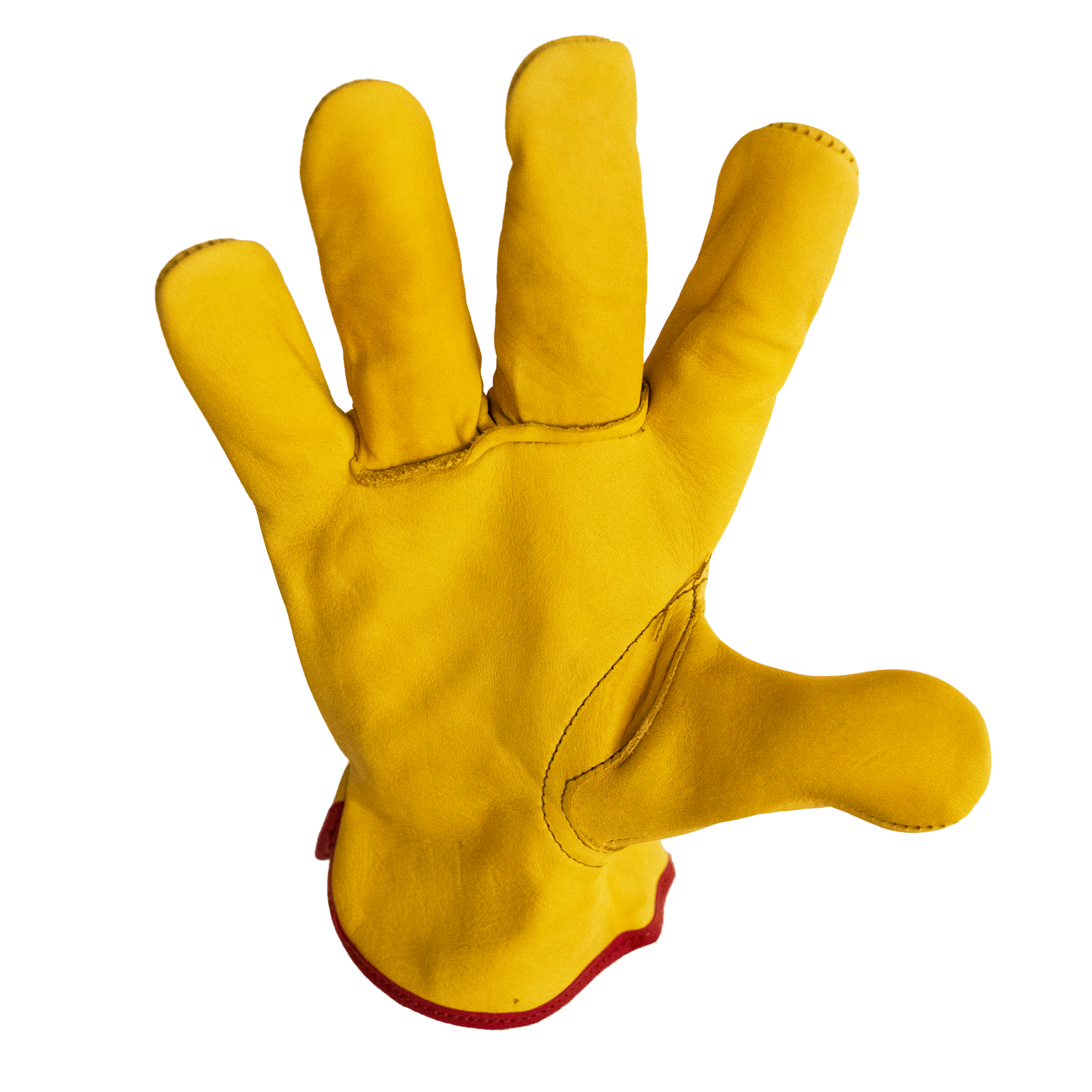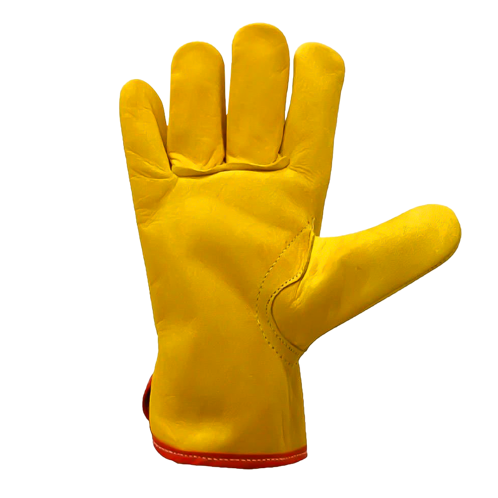 Guante de seguridad tipo operador en color amarillo. Está fabricado con material 100% de piel de res, lo que garantiza su resistencia y permite que sea impermeable. Su diseño integra un resorte para su ajuste en la muñeca y costuras reforzadas, además de ser flexible y cómodo.