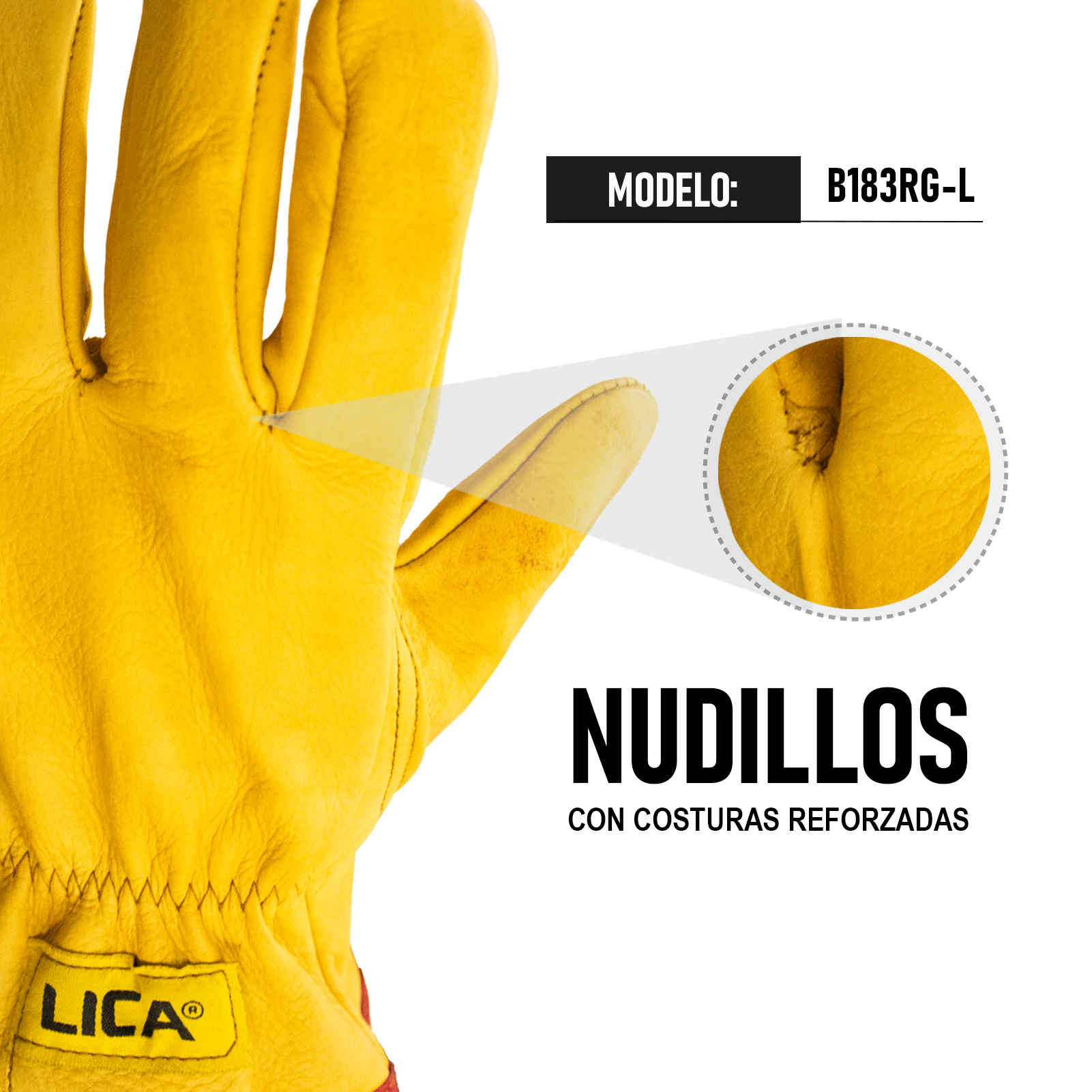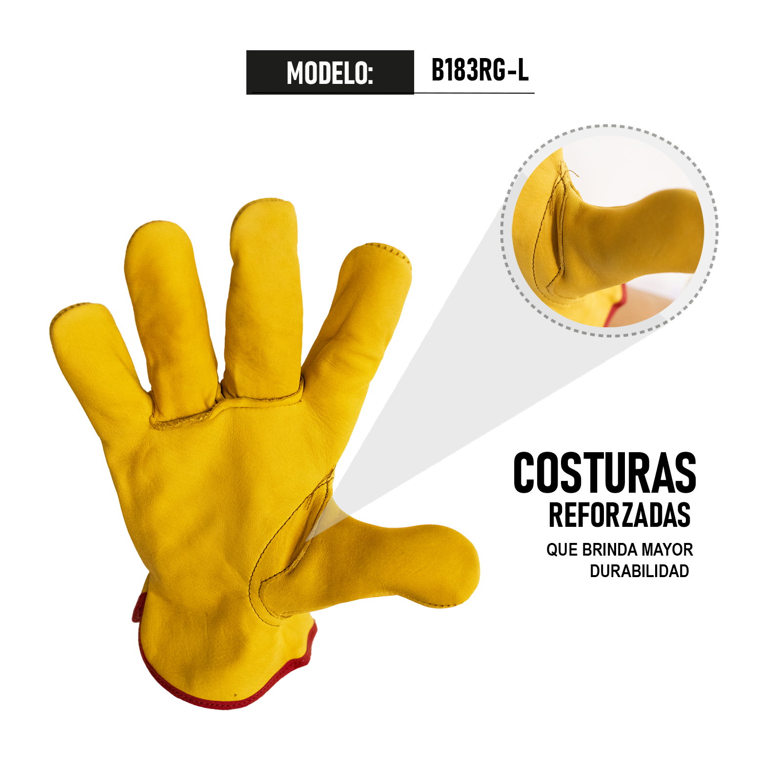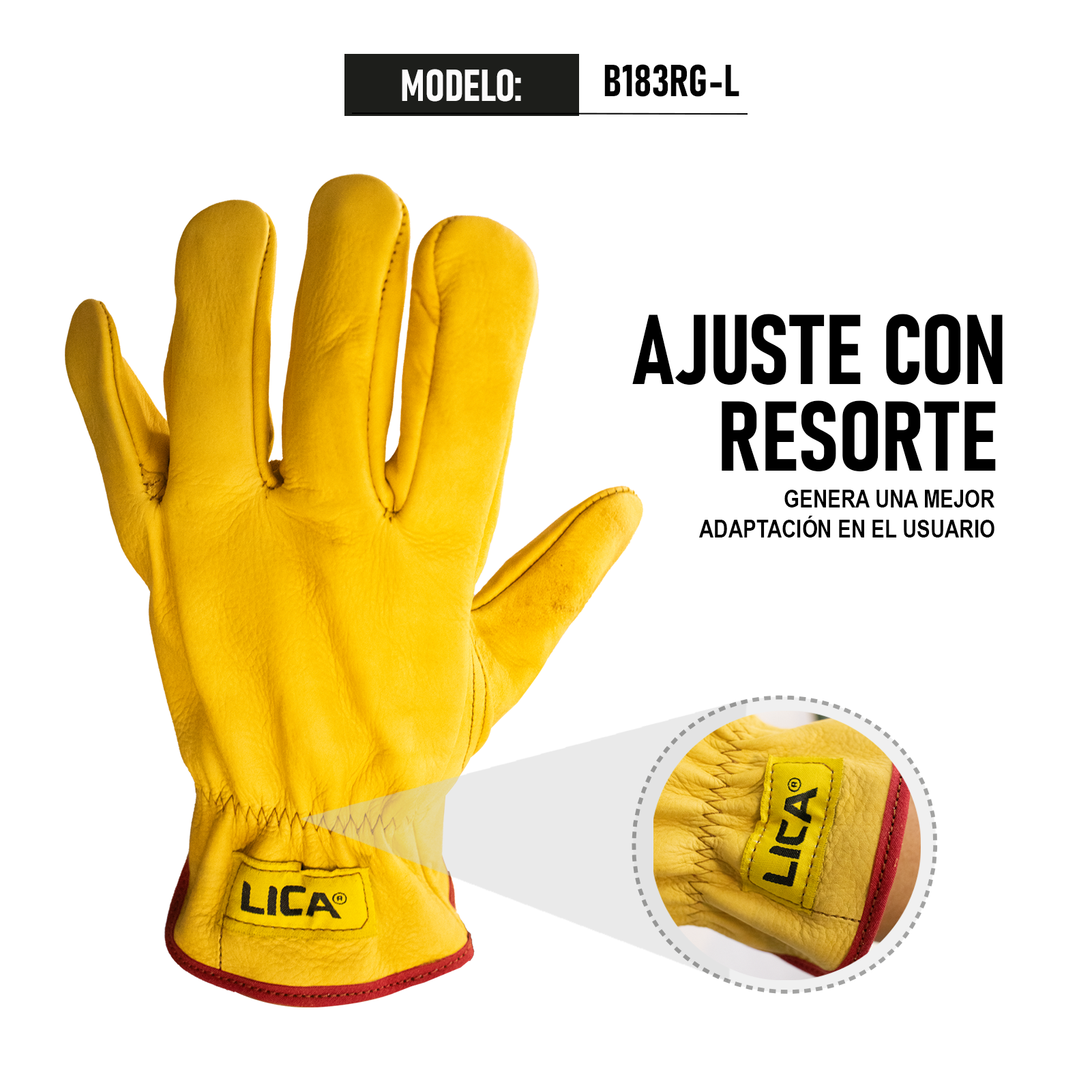 Clave: B183RG-L. Composición: 100% piel de res. Guante de piel con resorte para operador. Color: Amarillo. Presentación: Caja máster con 25 pares. Hecho en México.